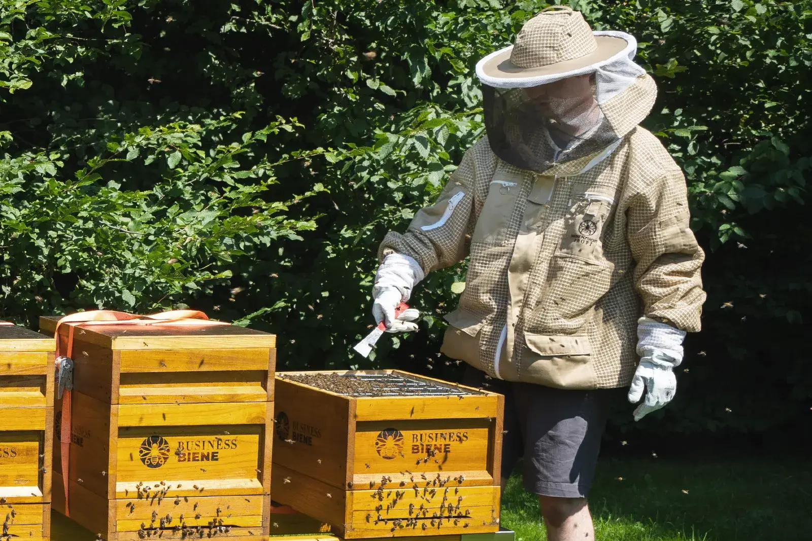 Victor Dutenhöfner von der BUSINESS BIENE lieferte fünf Bienenstöcke und setzte die jeweils 50.000 fleißige Bienen umfassenden Völker ein. MEV hat die Patenschaft für diese fünf Völker übernommen.