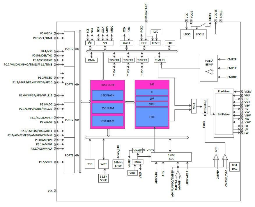 Der FU6861 integriert einen 8051-Mikrocontroller-Kern mit einer dedizierten Motorsteuereinheit (Motor Engine, ME) und bietet damit eine leistungsstarke Plattform für die sensorlose Steuerung von BLDC- und PMSM-Motoren. Durch die Kombination von Low-Dropout-Regler (LDO) und 180V-6N-Gatetreiber in einem einzigen Chip ermöglicht der FU6861 eine kompakte und kosteneffiziente Lösung für verschiedene Anwendungen.