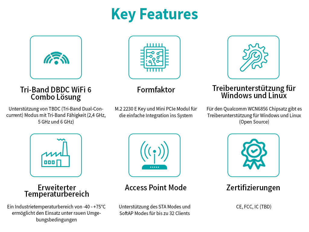Die Tri-Band Lösung basierend auf dem Chipsatz Qualcomm WCN6856 ermöglich M.2 2230 und Hal Mini PCIe Modulen das TBDC (Tri-band Dual-concurrent) Feature. Die Module WNFQ-268AXI(BT) / WPEQ-268AXI(BT) bieten darüber hinaus weitere Vorteile für den industriellen Einsatz, wie z.B. einen erweiterten Temperaturbereich und einen langen Produktlebenszyklus. Ergänzend bietet unserer Partner Sparklan Unterstützung für Windows und Linux Systeme.