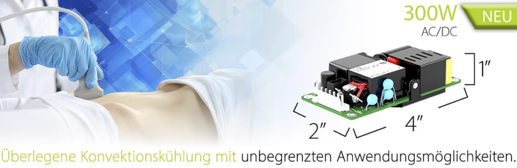 Neu auf dem Markt: EIRE300 AC/DC-SNTs in offener Bauweise mit hoher Leistungsdichte von 300 W auf nur 4 · 2 Zoll Fläche bei 1 Zoll Höhe mit Zulassung für Medizin/BF (2xMOPP) und ITE