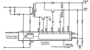 Flybackregler sind die erste Lösung am Markt, welche mit einer 1700V GaN-Technologie verfügbar sind. Eine zweite Ausgangsspannung kann über eine sekundäre Wicklung realisiert werden. Sie sind geeignet für Nenn-Eingangsspannungen von 1000V und können mehrere Ausgangsspannungen mit einem Wirkungsgrad von über 90% zur Verfügung stellen. Eine nachgelagerte Regelung ist oft nicht notwendig, da die Ausgangsspannungen mit einer Genauigkeit von 1% geregelt werden können, wodurch sich die Systemeffizienz erheblich verbessern kann.